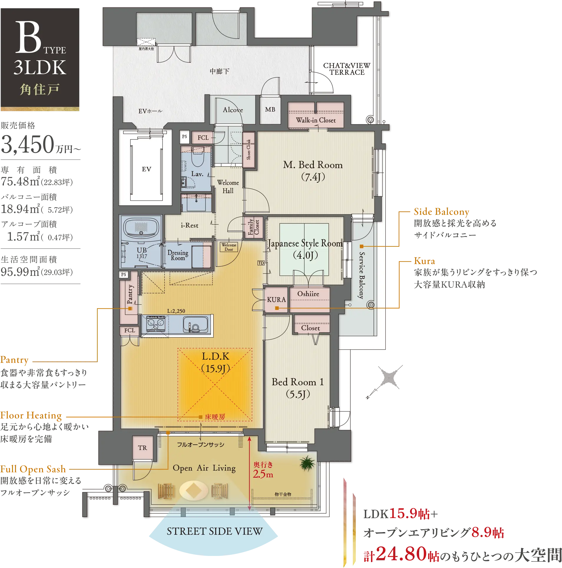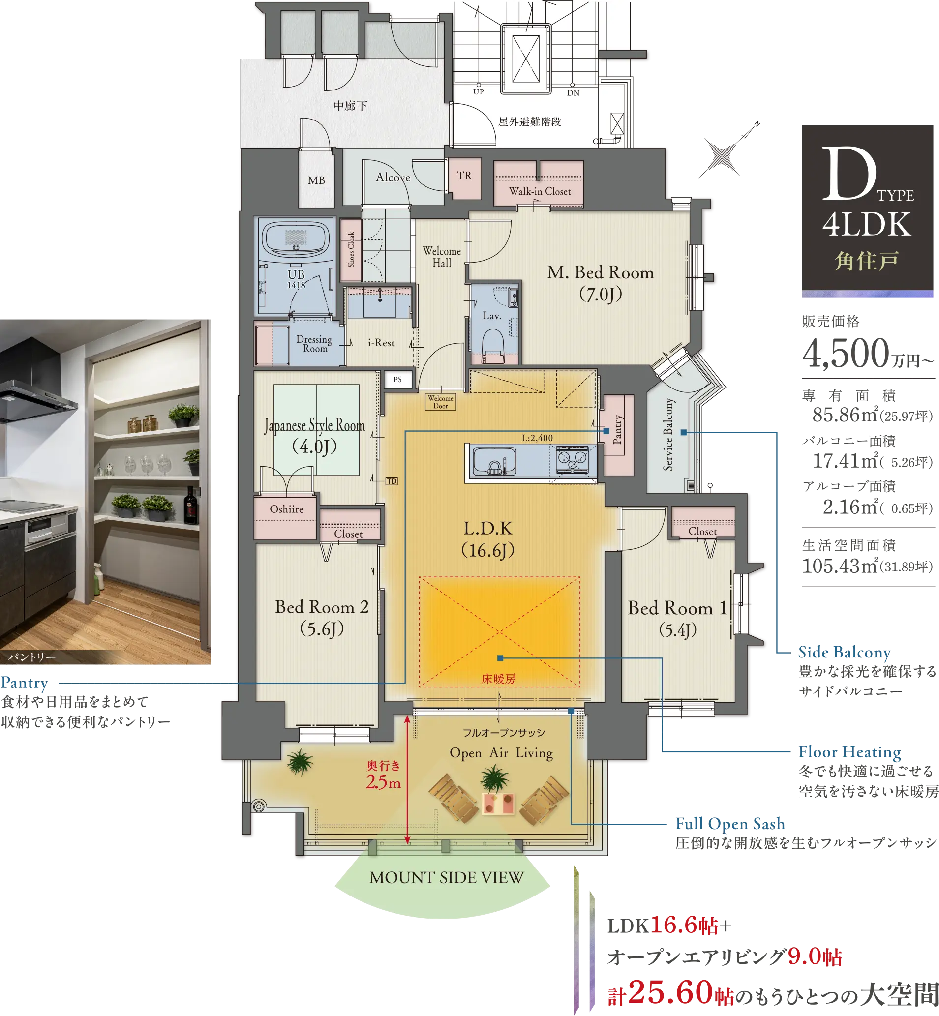 全体プランニングの工夫により、全戸角住戸と中廊下を採用。 2面採光による明るさに加え、奥行き2.5メートルのオープンエアリビングが、開放感あふれる居住空間を演出します。